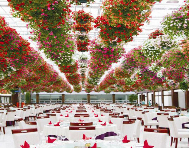 綠色生態(tài)餐廳中廳采用大型鋼結(jié)構(gòu)形式,跨度大,高度高、可植入高大樹木,設(shè)置亭臺,造景時有更大的發(fā)揮空間,使景色更加逼真。中廳周圍設(shè)置其他配套連棟溫室,大部分餐飲設(shè)置于其中,降低大大的造價和后期維護(hù)費用,同時保證了充足的活動空間,美景美食交相輝映,相得益彰。